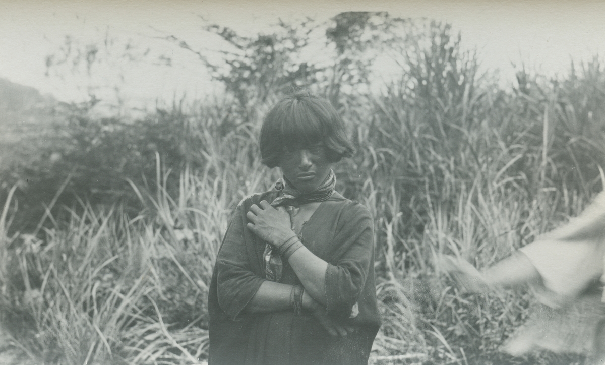 Fotografi från expedition till Peru 1920. Porträtt av man framför buske i djungeln.