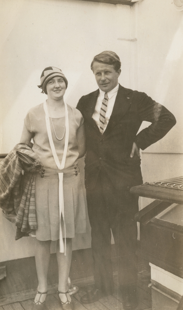 Fotografi från låda märkt Bernt Balchen. Balchen var norsk-amerikansk flygare, polarforskare och militär. Motiv av Bernt Blachen och kvinna ombord på båt.