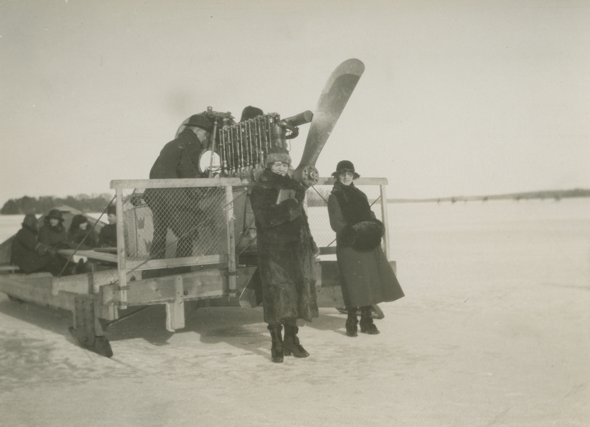 Diverse bilder från Fred Goldbergs samling. Motiv av en grupp människor på och vid stor kälke med motor och propeller. Hägernäs 1922-23.