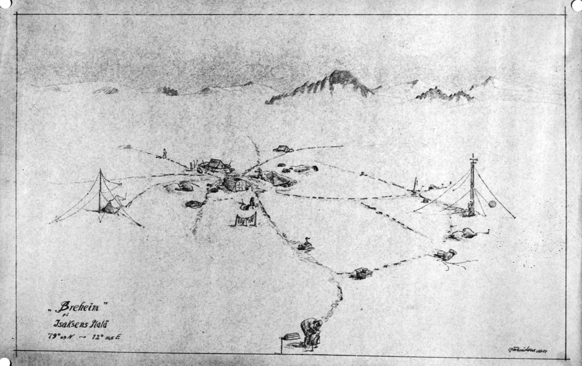 Fotografi från expedition till Spetsbergen. Teckning av läger uppsatt i snölandskap med texten: "Breheim, Isaksens platå".