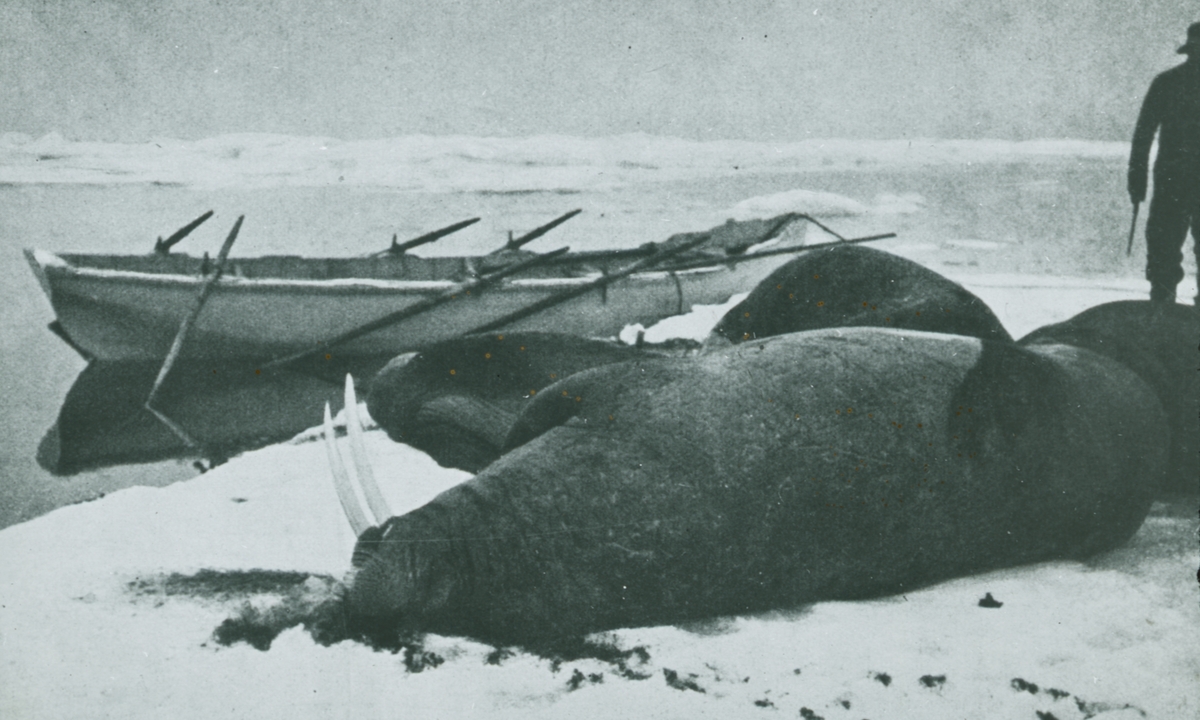 Glasnegativ med motiv av slaktad valross på snötäckt mark invid roddbåt.