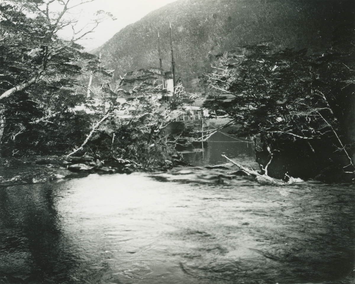 Bild från expedition i Antarktisområdet. Motiv av båt i flod.