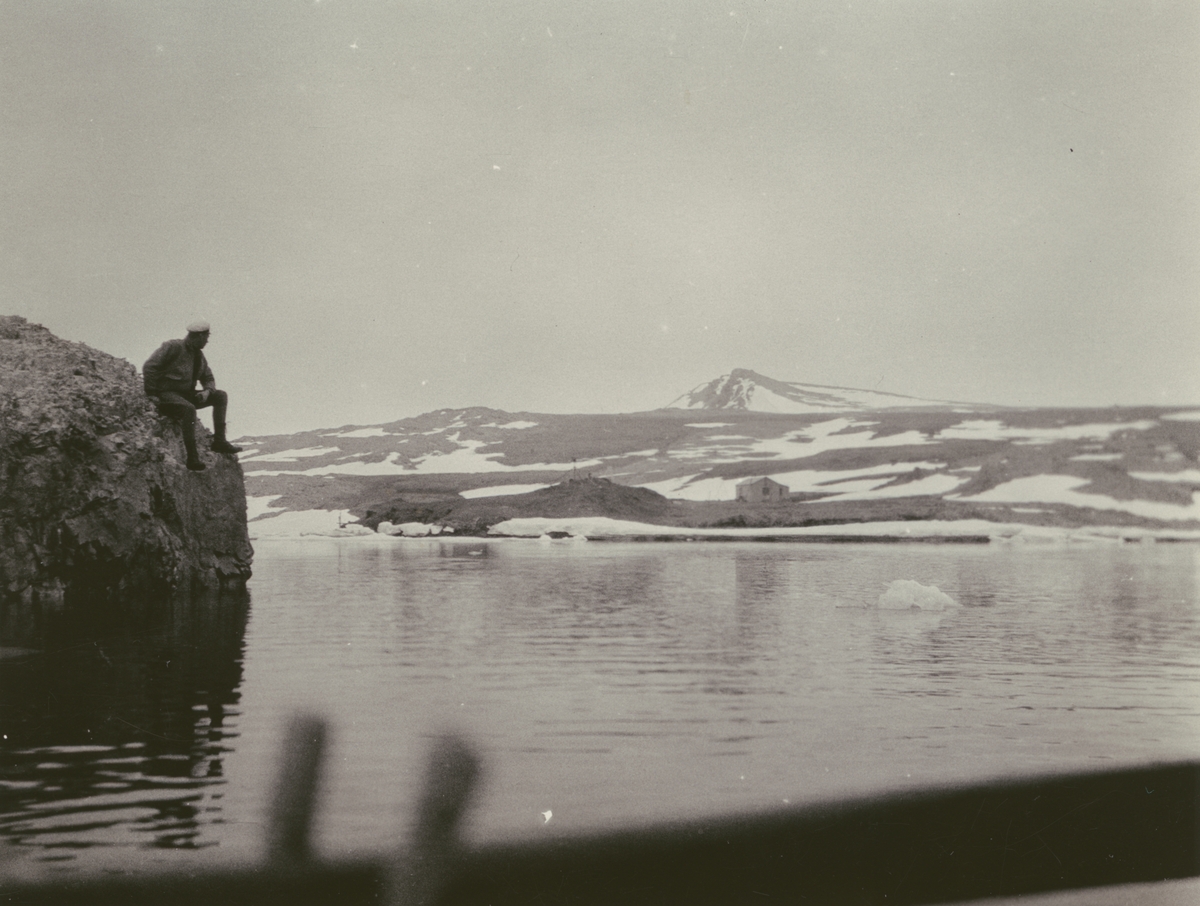 Fotografi från Ahlmannexpeditionen 1931. Motiv av man som sitter på klippa bredvid vatten och snötäckt berg.
