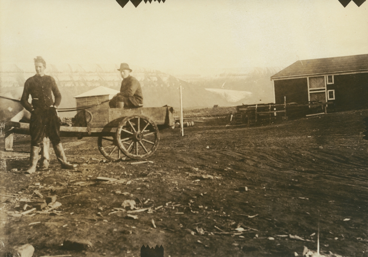 Fotografi från expedition till Spetsbergen 1920. Motiv av två män vid en träkärra framför ett hus.