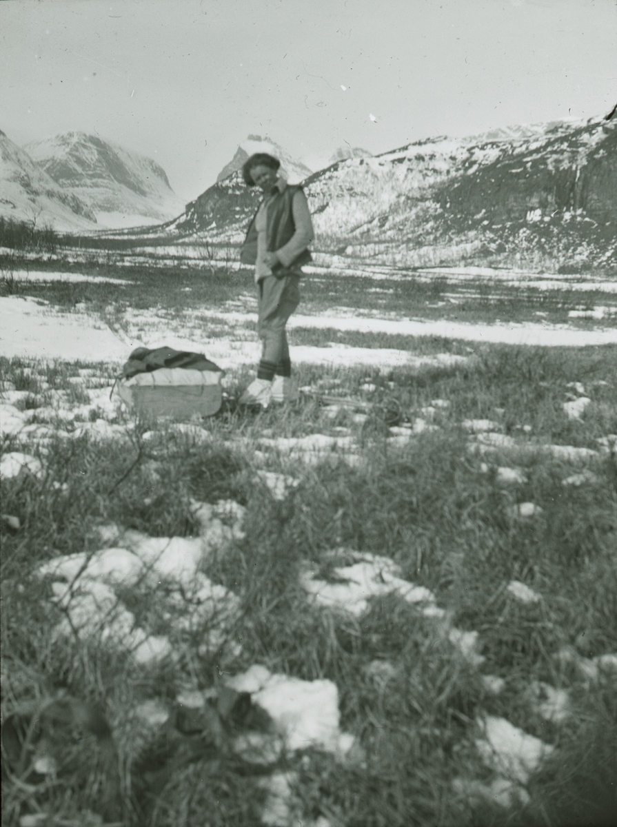 Fotografi från expedition till Spetsbergen. Motiv av kvinna i snötäckt bergslandskap.