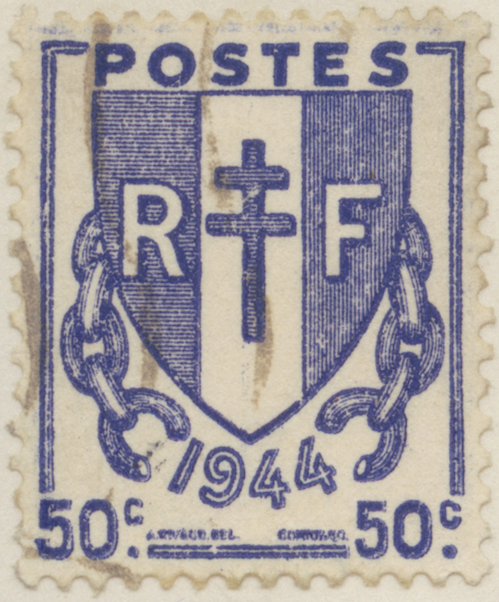 Frimärke från Frankrike, 1945. Motiv av Symboliskt Vapen: Lorraine korset och Brutna kedjor. -Minne av Frankrikes frigörelse efter världskrig II: 1945-