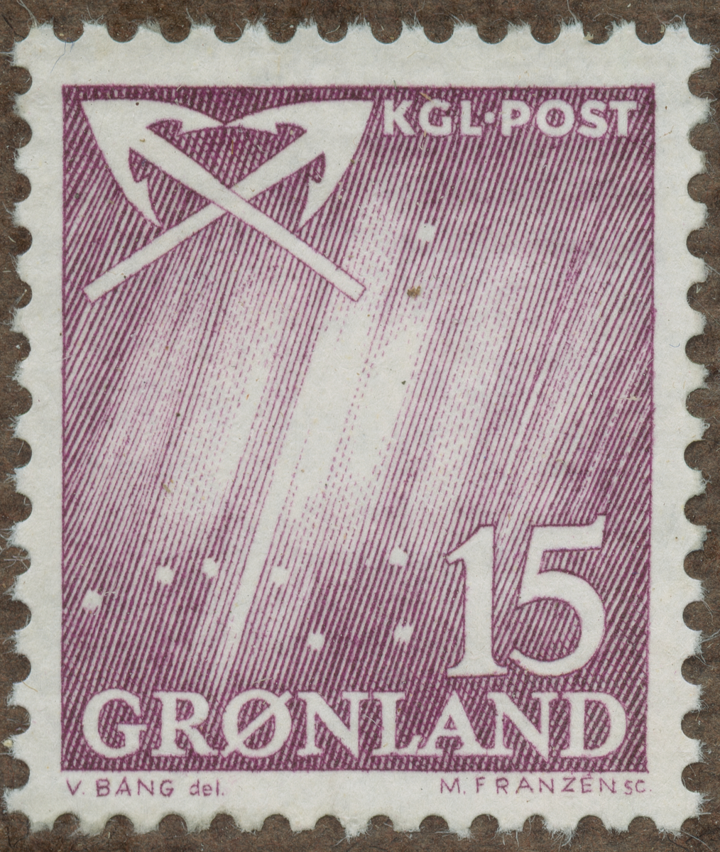 Frimärke från Grönland, 1963. Motiv av Harpuner: symbol för Grönland -norrsken, karlavagnen-