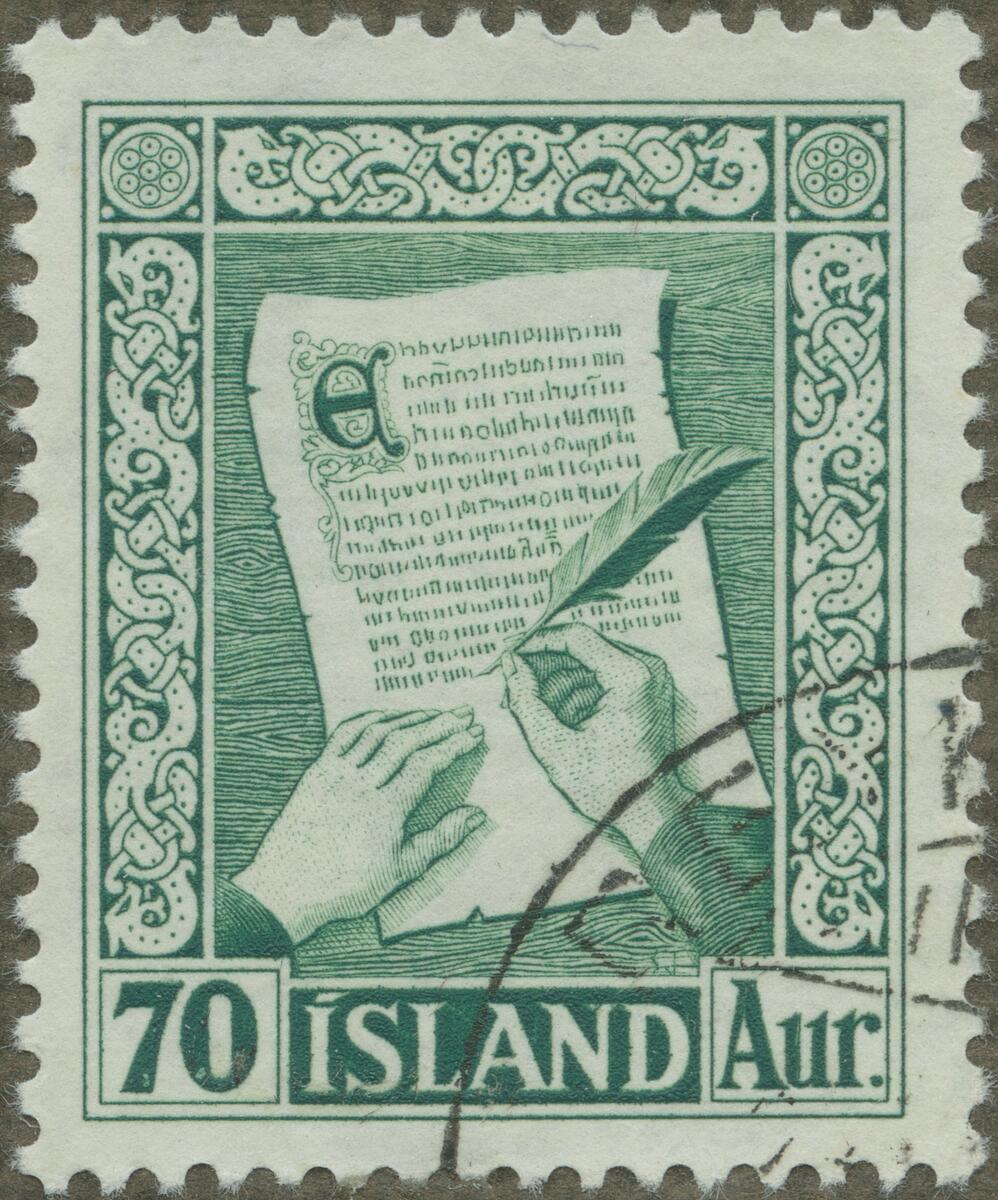 Frimärke från Island, 1953. Motiv av Gammal handskrift: kalligrafi "Gamla isländska handskrifter, serien."