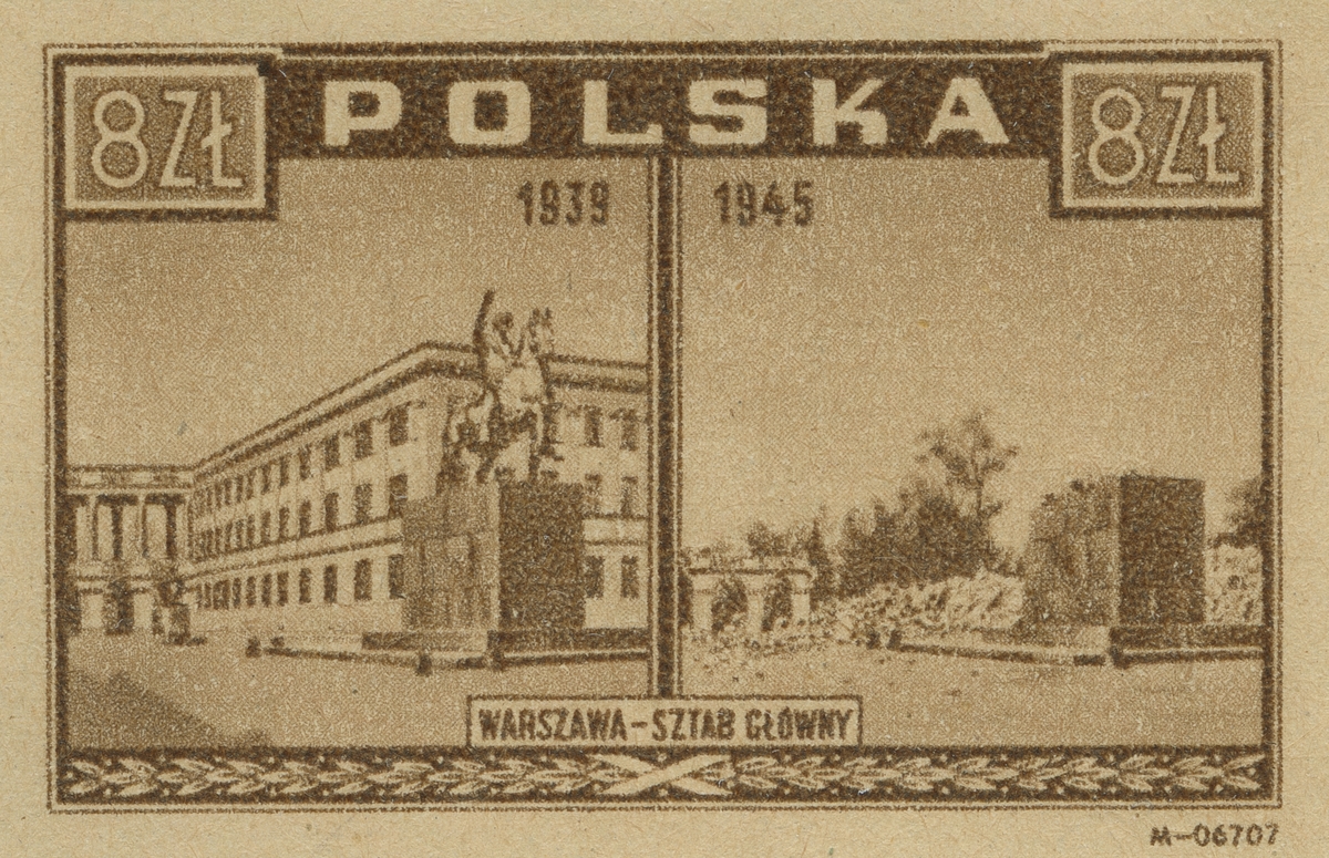 Frimärke från Polen, 1945. Motiv av Före och efter bombning Warschau - Sztab Gówny