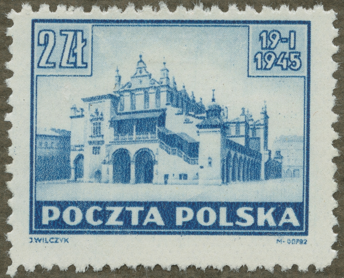 Frimärke från Polen, 1945. Motiv av Byggnad i polsk stad. (Klädeshallen) Krakaus befrielse. Den 19 januari 1945.