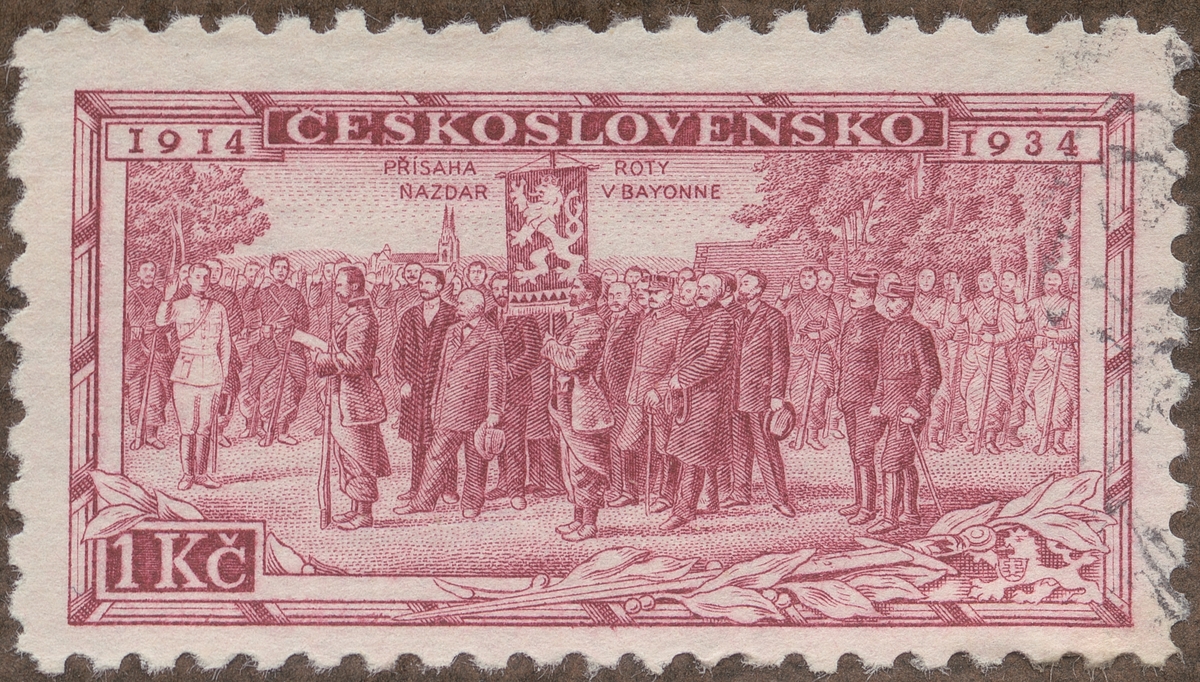 Frimärke från Tjeckoslovakien, 1934. Motiv av Kompanifana "Nazdar", den första tjeckoslovakiska legionen, mottagar kompanifanan i Bayonne 1914. -20-årsminne av legionerna: 1914-1934.