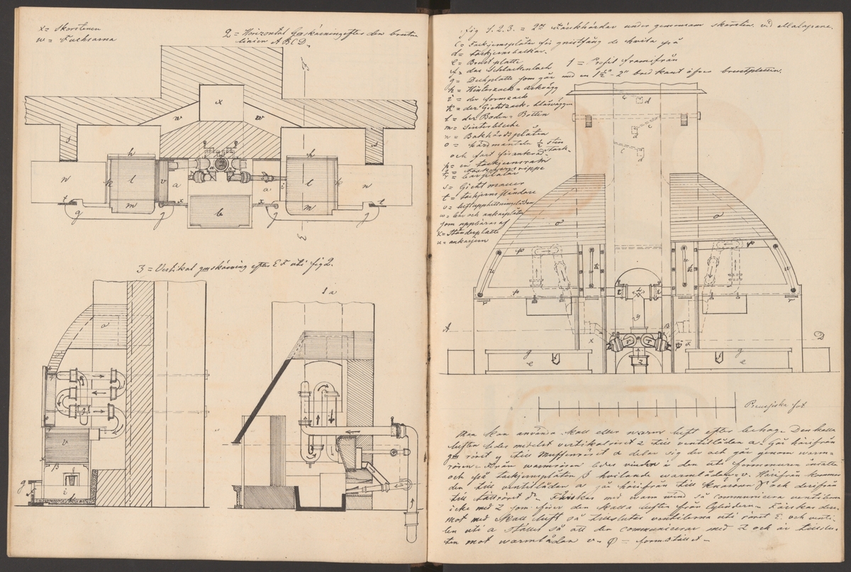 Titel: J.O. Carlberg. Skissbok för ugnskonstruktioner med ritningar av professor J.O. Carlberg 1845, hörande till hans reseanteckningar från utlandet. Ämnesordnade handlingar av bergshistoriskt och bergstekniskt innehåll. Ur Carl Sahlins bergshistoriska samling.