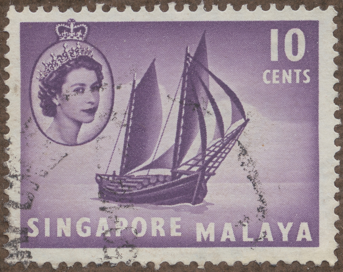 Frimärke från Singapor, 1955. Motiv av Primitiv segelbåt s.k. "tongkong" Singapor