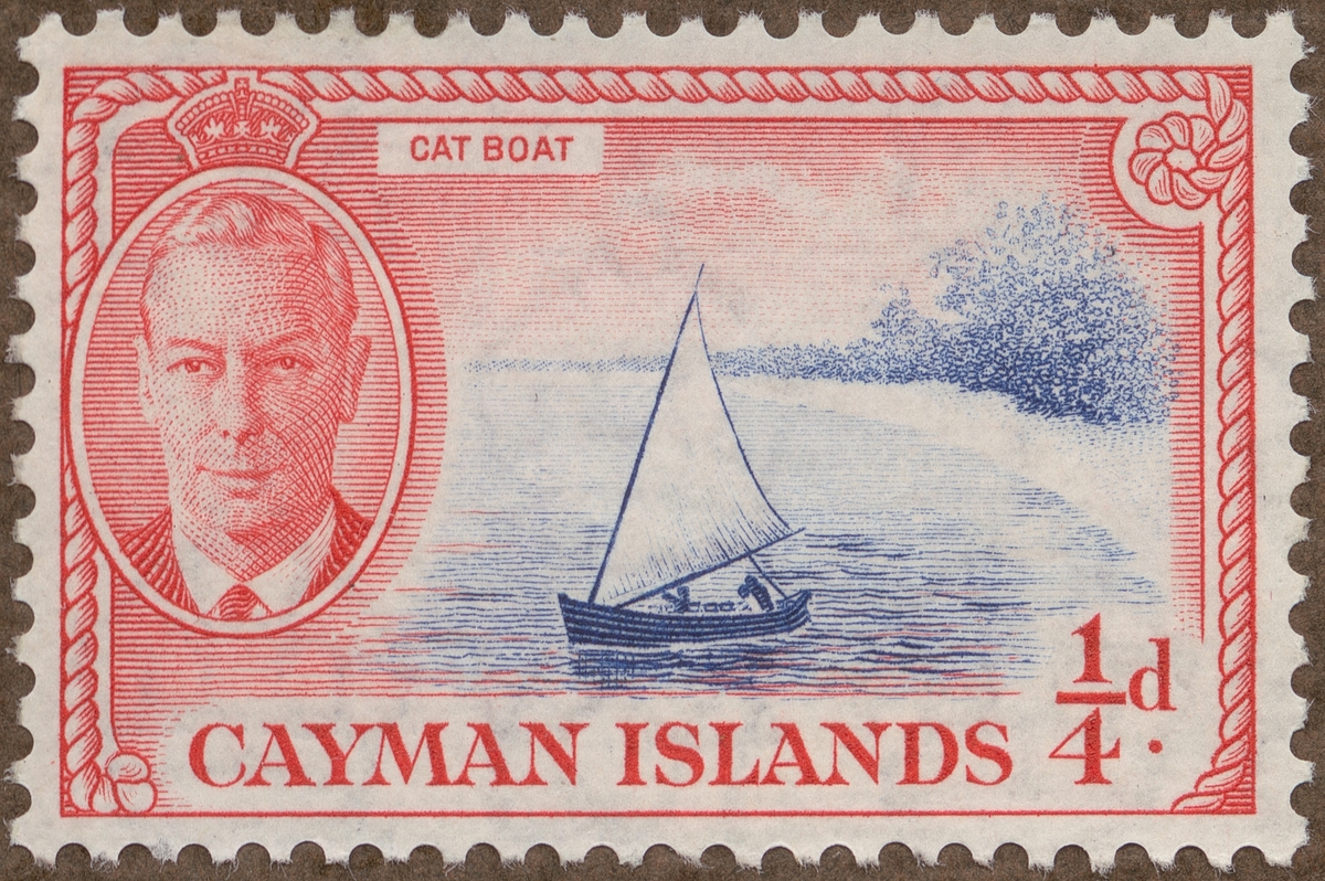 Frimärke från Caymanöarna, 1950. Motiv av Enkel lustsegelbåt, s.k. "catboat" med 1 mast o. 1 segel (t.v.) Kung George VI.