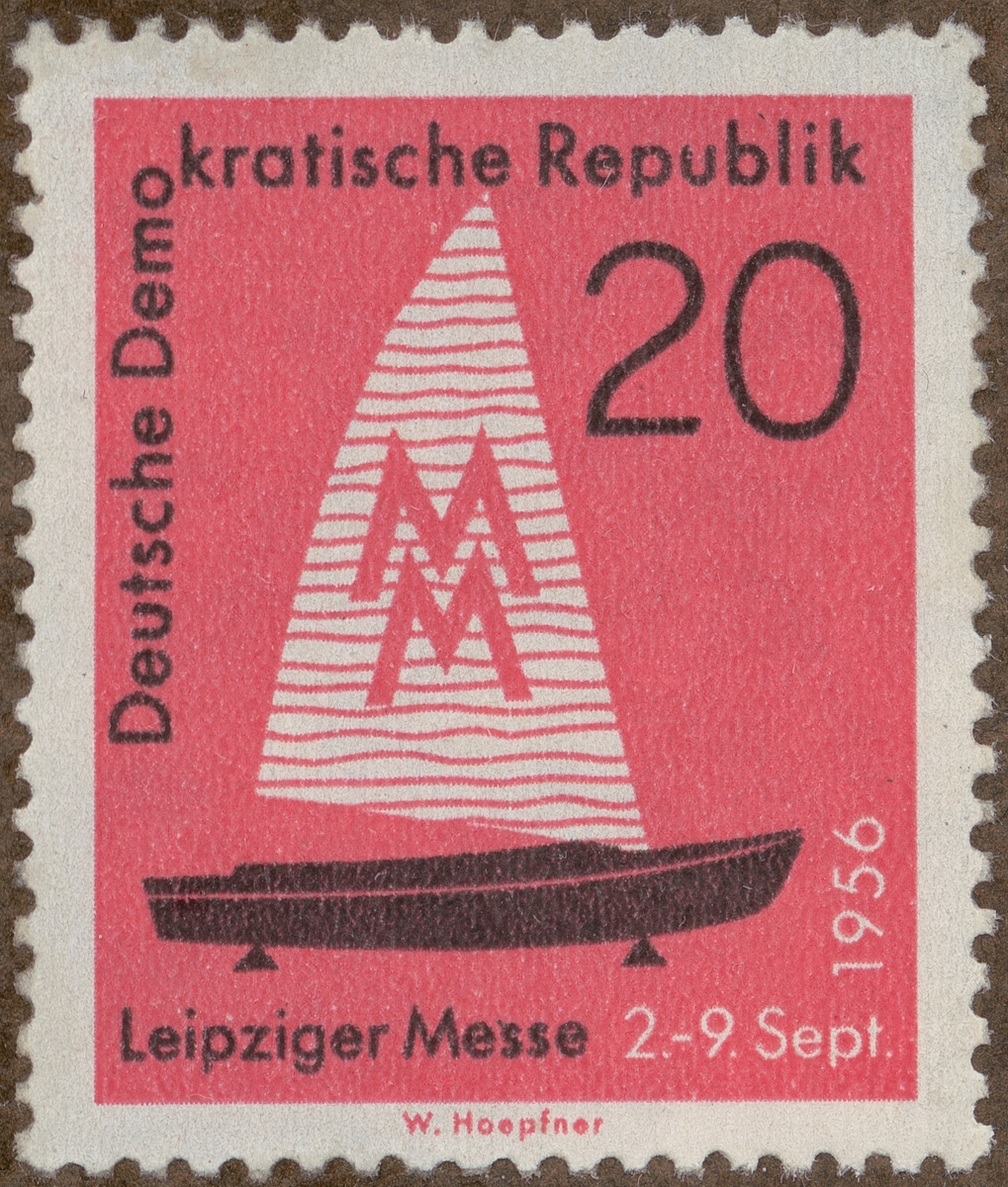 Frimärke från Öst Tyskland, 1956. Motiv av Mindre Segelbåt Höst Mässan i Leipzig 2-9 sept 1956