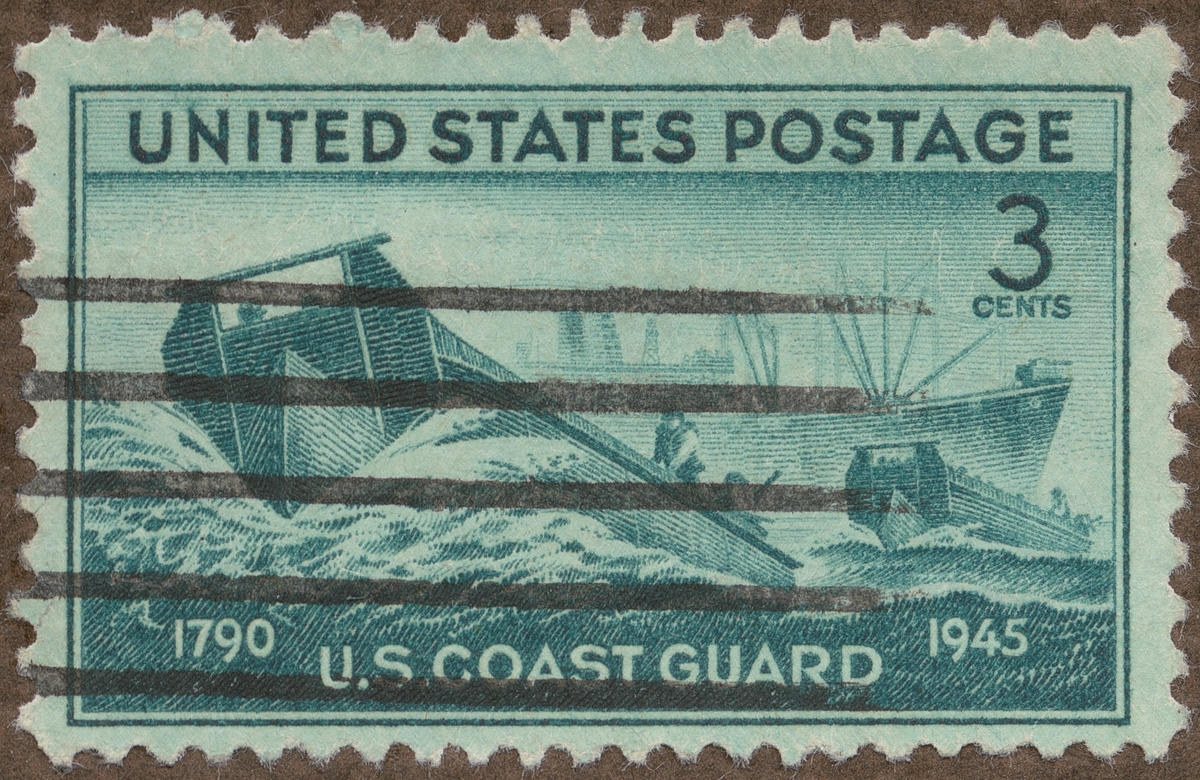 Frimärke från U.S.A., 1945. Motiv av Landstignings båter (med förrådsfartyg i bakgrunden) Kustförsvaret ("U.S. Coast Gard") 155 år: 1790-1945. "Serie: Arméns och flottans insats under världskrig II."
