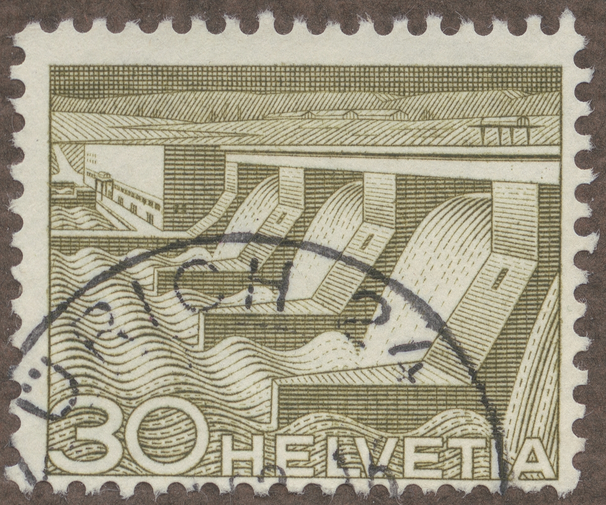 Frimärke ur Gösta Bodmans filatelistiska motivsamling, påbörjad 1950. Frimärke från Schweiz, 1949. Motiv av Vattenkraftverket vid Verbois i Schweiz