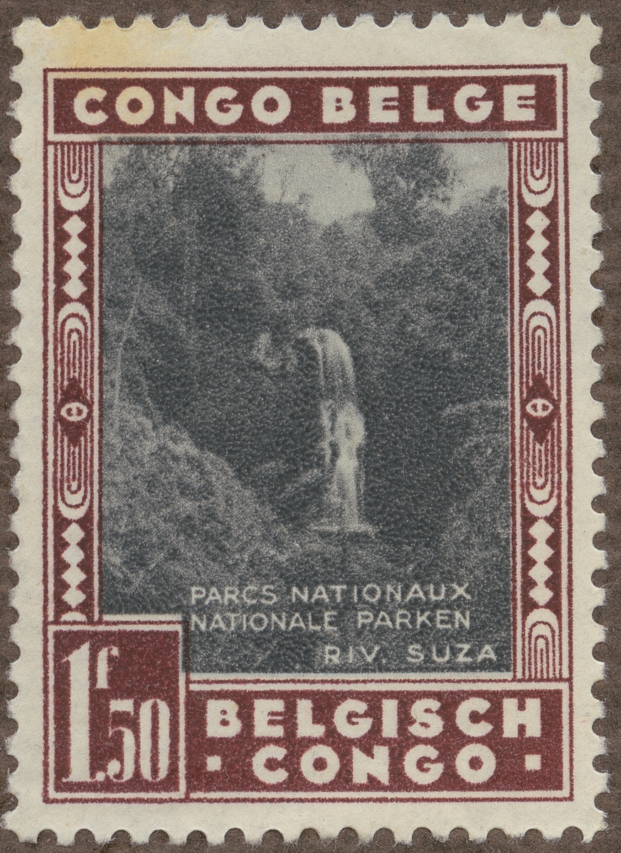 Frimärke ur Gösta Bodmans filatelistiska motivsamling, påbörjad 1950. Frimärke från Belgiska Congo, 1938. Motiv av Vattenfall i floden Suza "-Nationalpark i Congo- Serie: Congos nationalparker.-"