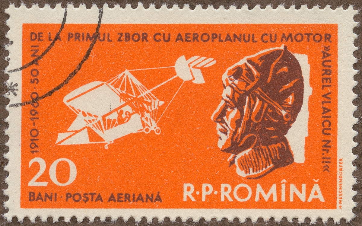 Frimärke från Rumänien, 1960. Motiv av Auriel Vlaicu och hans flygplan. "Flygets Dag och 50-årsjubileum av förste rumänska flyget: 1910- 1960."