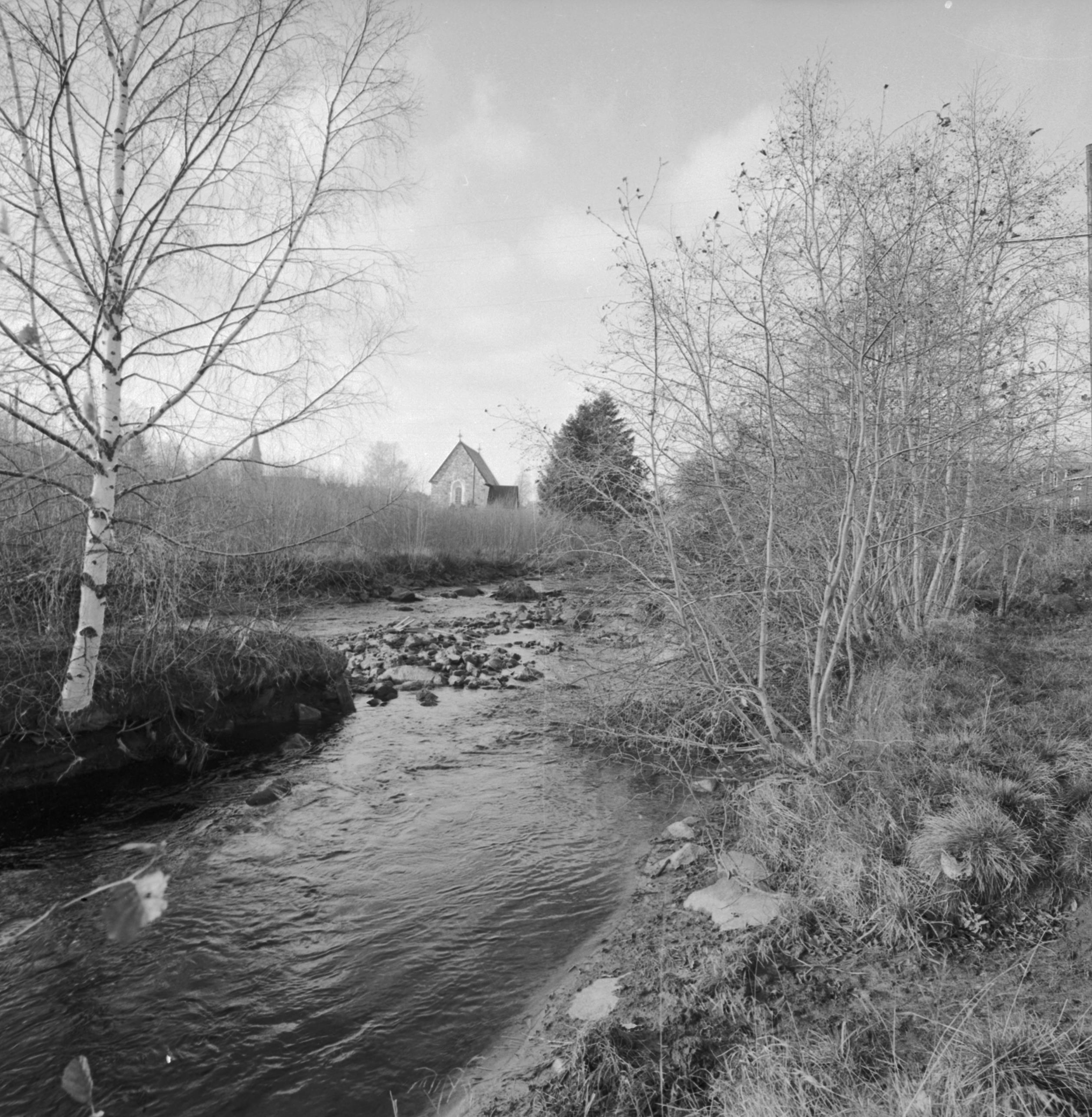 Kyrkan från öster med omgivning, den nya kyrkans torn till vänster.