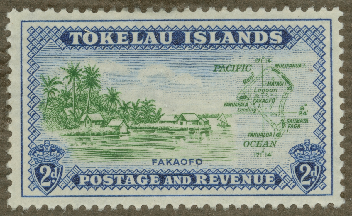 Frimärke från Tokelau-öarna, 1948. Motiv av Strand med hyddor och palmer på Fakaofoön samt karta över Tokelau-öarna.