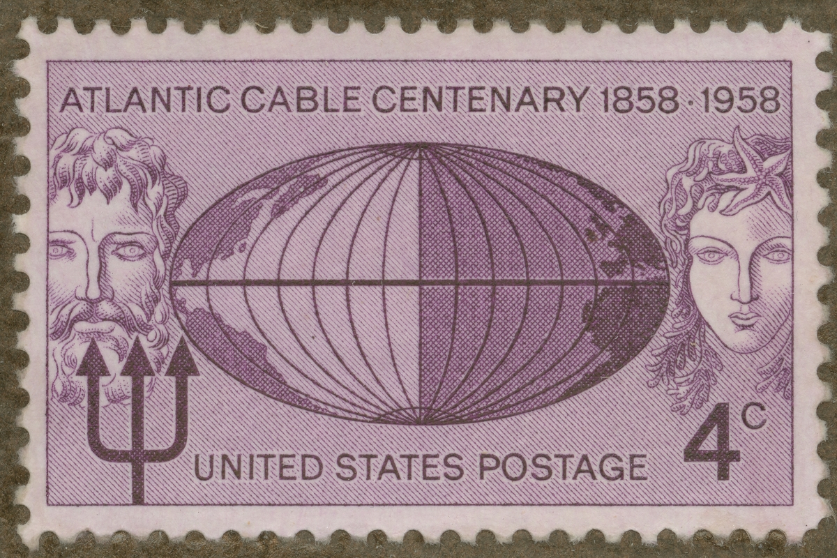 Frimärke från USA, 1958. Motiv av jordglob med Atlanten, Neptunus. "Atlantkabeln 100-årsminne 1858-1958".