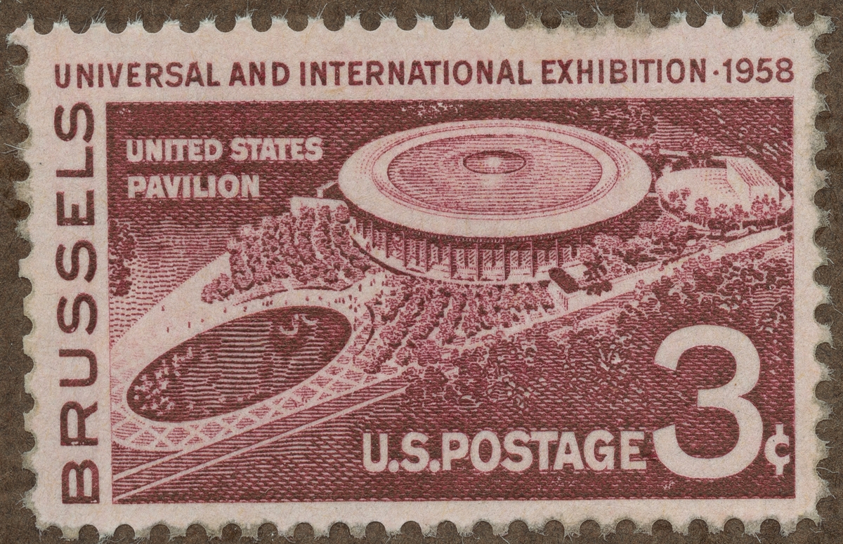 Frimärke från U.S.A., 1958. Motiv av U.S.A.-s paviljong Världsutställningen i Bryssel 1958