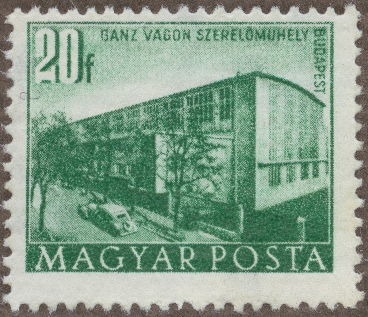 Frimärke ur Gösta Bodmans filatelistiska motivsamling, påbörjad 1950. Frimärke från Ungern, 1951. Motiv av Järnvägs Verkstad i Budapest "Återuppbyggnadsserie"