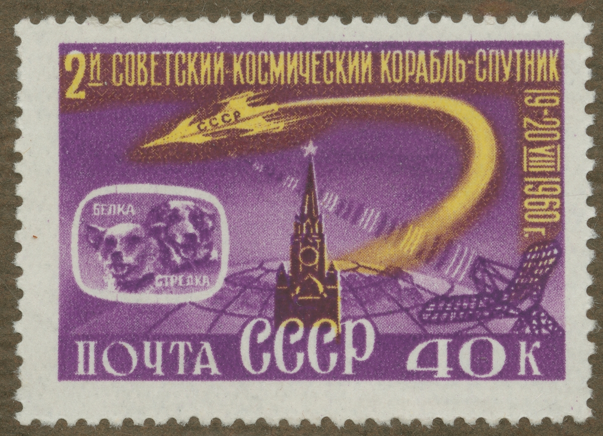Frimärke från Ryssland, 1960. Motiv av Kremlin med Sovjetstjärnan. "Rymdskeppet Sputnik II över Moskwa och jorden med rymdhundarna Belka och Strelka som passagerare 19-20 augusti 1960".