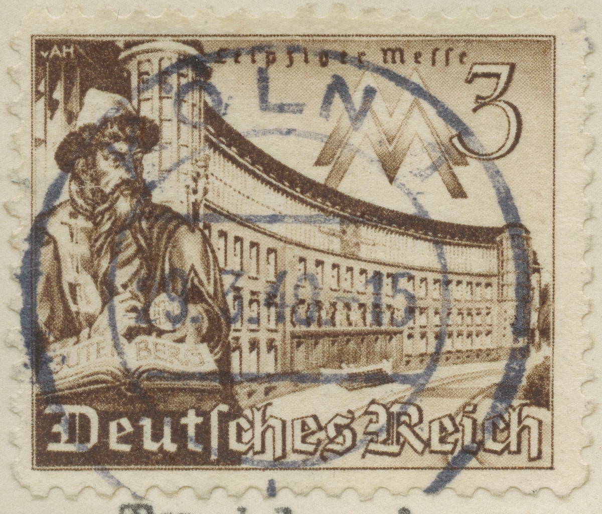 Frimärke från Tyskland, 1939. Motiv av Bok Mässan i Leipzig (t.v.): Gutenbergs Byst