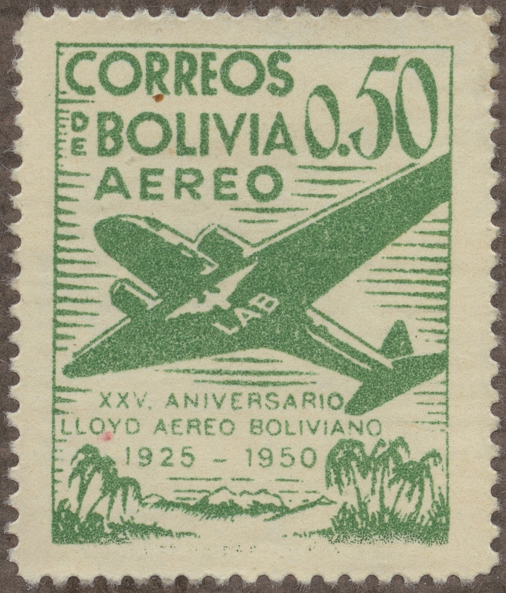 Frimärke från Bolivia, 1950. Motiv av 2-motorigt monoplan Flygbolaget: Lloyd Aereo Boliviano 25 år 1925-1950.