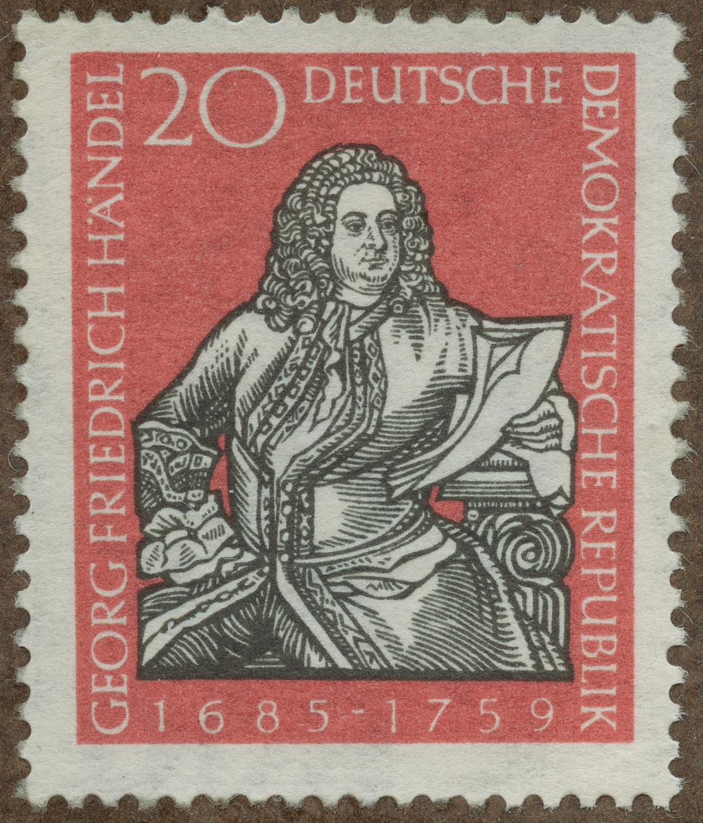 Frimärke från Öst Tyskland, 1959. Motiv av Georg Friedrich Händel 1685-1759 Kompositör 200-årsminne av hans död: 1759-1959.