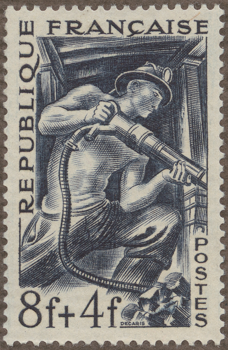 Frimärke från Frankrike, 1949. Motiv av Fransk gruvarbetare i arbete med borrmaskin. "Serie gällande olika yrken,"