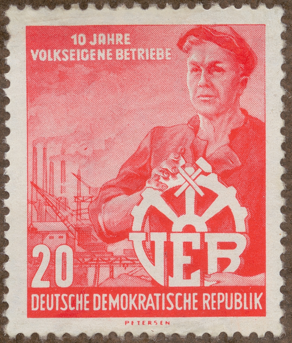 Frimärke från Öst Tyskland, 1958. Motiv av Metallarbetare Kugghjul Fabrik "Volks Eigene Betriebe" 10 årsminne