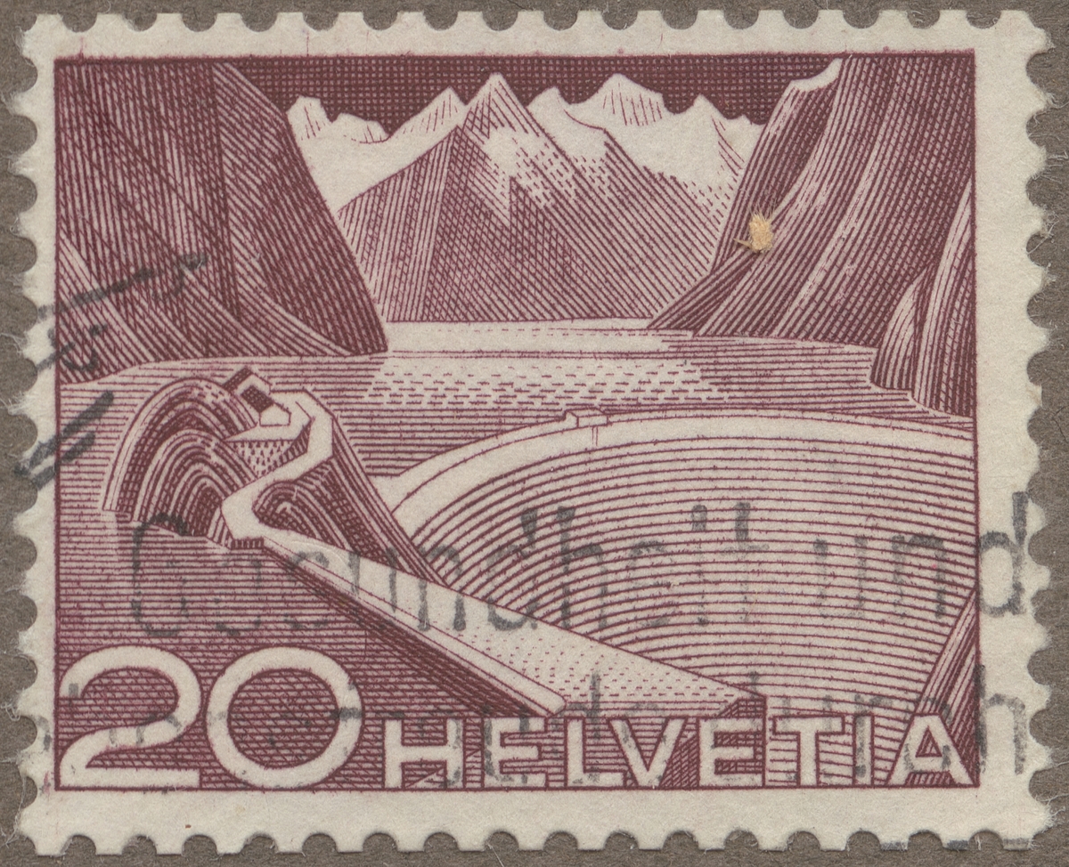Frimärke ur Gösta Bodmans filatelistiska motivsamling, påbörjad 1950. Frimärke från Schweiz, 1949. Motiv av Kraftverksdam i Alperna vid Grimsel