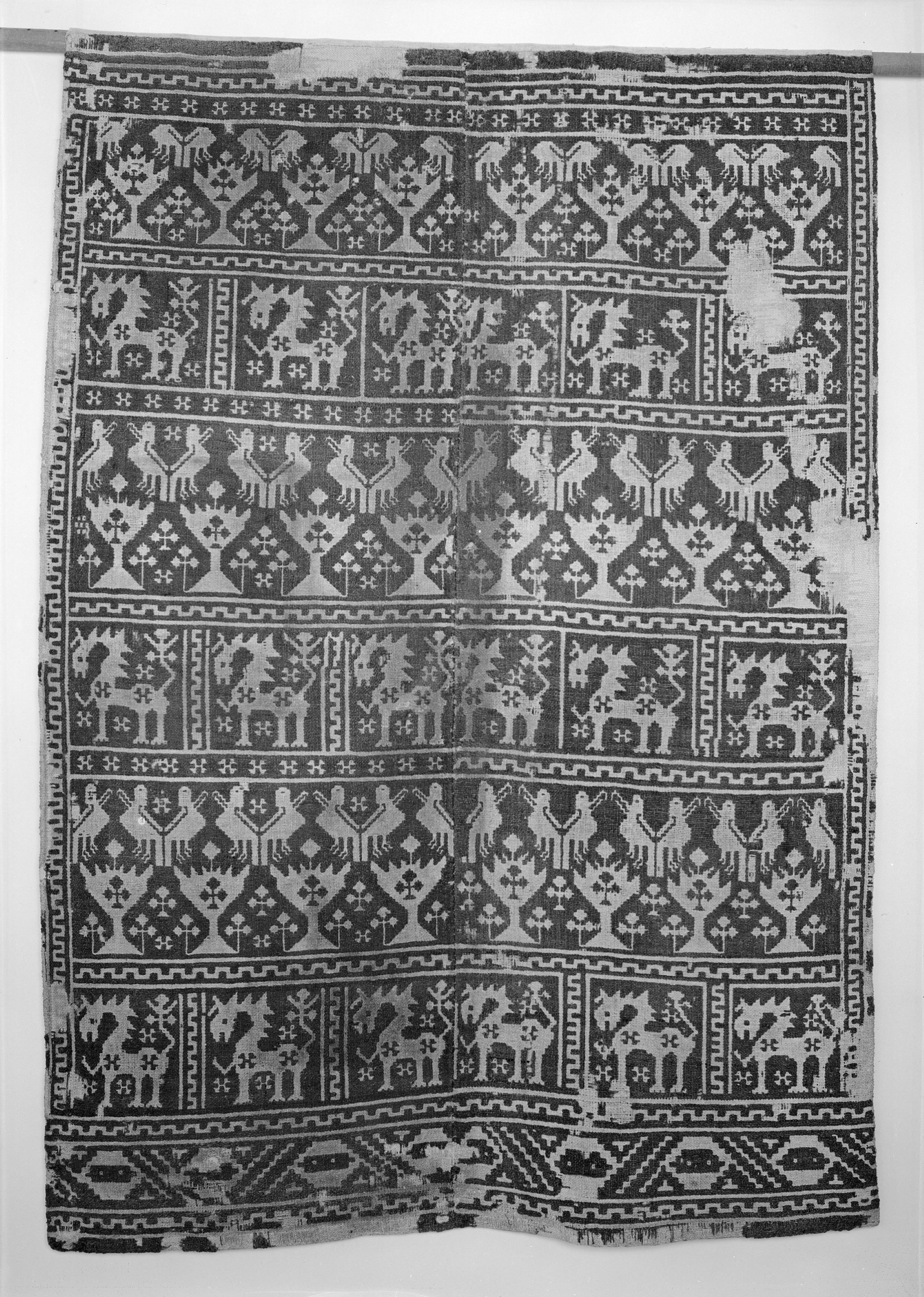 Täcke, dubbelvävnad av brunrött ullgarn och vitt lingarn. Svenskt arbete, 1500-talet