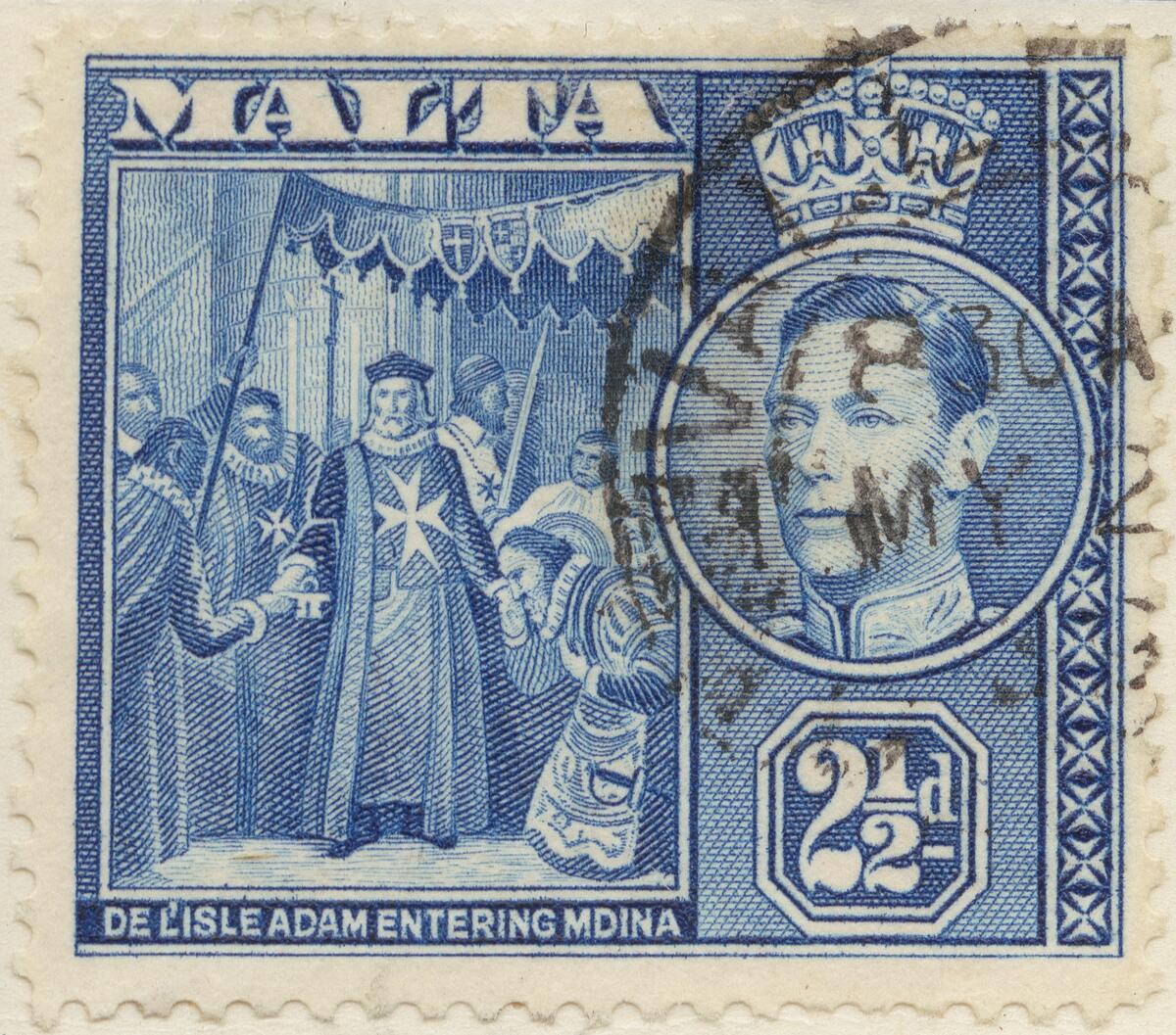 Frimärke från Malta, 1938. Motiv av D L'Isle Adam tager Malta i besittning (t.h.) Kung George VI
