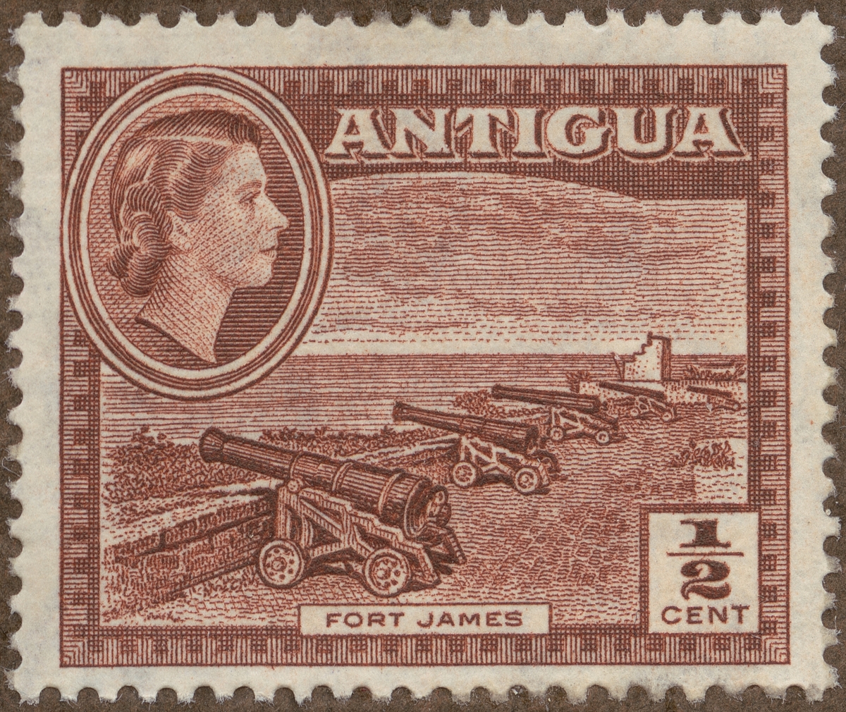 Frimärke från Antigua, 1956. Motiv av Fort James med sina kanoner (t.v.): Drottning Elizabeth II-