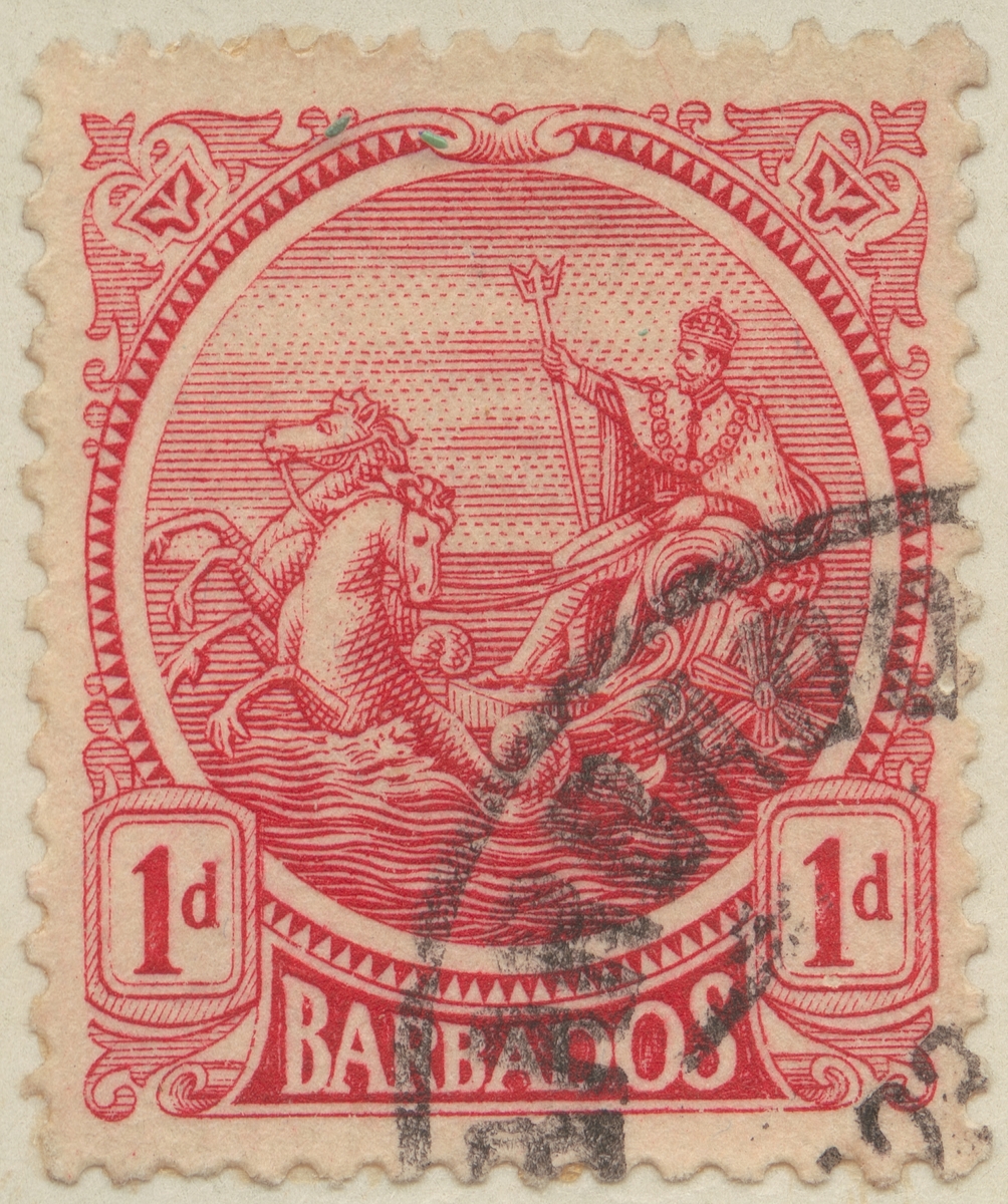 Frimärke från Barbados, 1916. Motiv av Symbol för Englands herravälde över haven -Kung George V. av England-