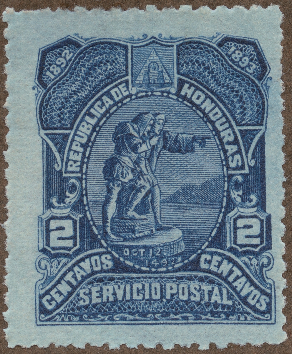 Frimärke från Honduras, 1892. Motiv av Columbus och Pinzon beskådar Honduras:s kust 12 oktober 1492. -400-årsminne: 1492-1892.