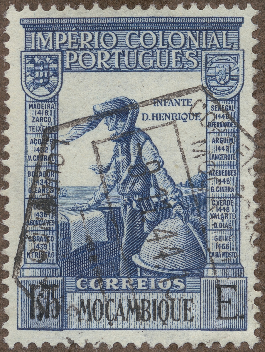 Frimärke från Mozambique, 1938. Motiv av Den portugisiska Henrik Sjöfararen 1394-1460. Infant av Portugal. Navigationsintresserad. Utsände forskningsresande utefter Afrikas västkust ned till Senegambien (nuv. Sénégal).