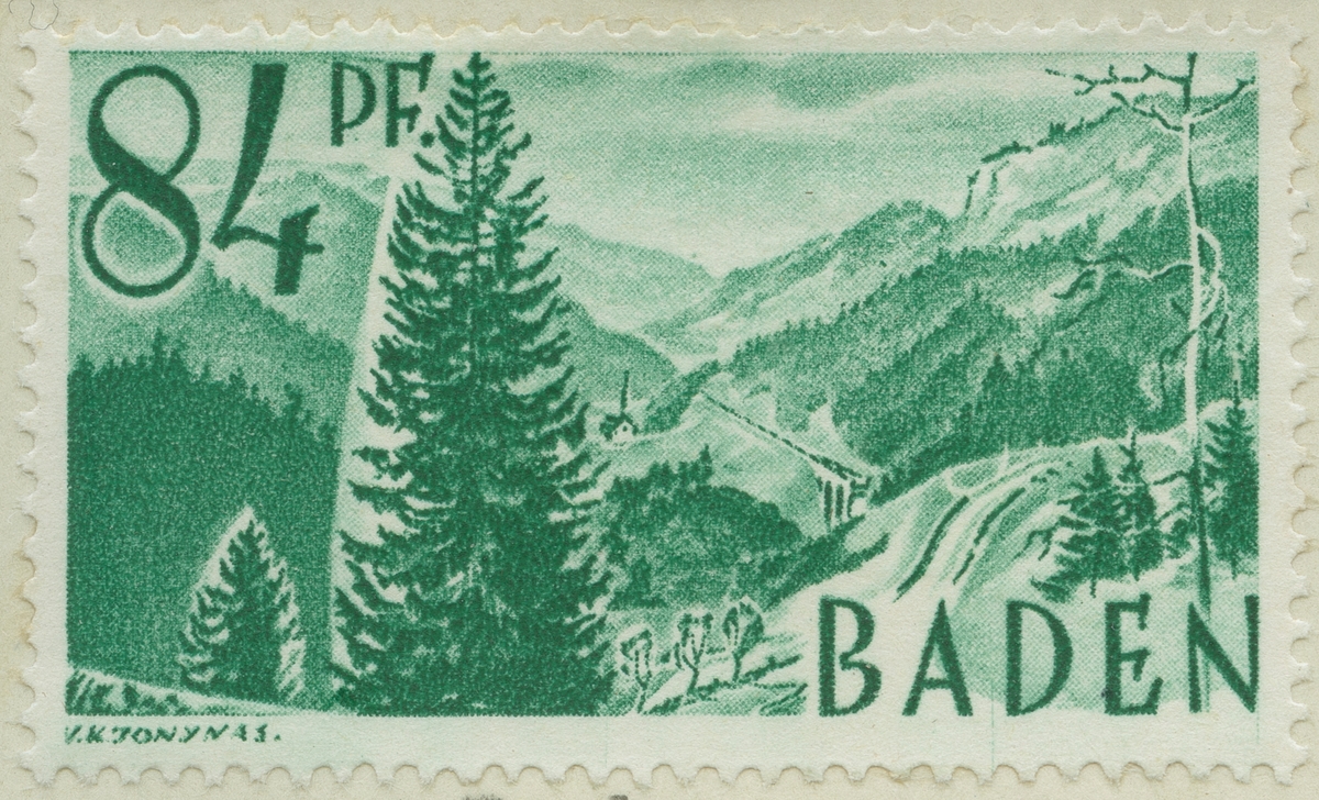 Frimärke ur Gösta Bodmans filatelistiska motivsamling, påbörjad 1950. Frimärke från Tyskland Baden, 1947- Motiv av Höllenthal i Schwartzwald