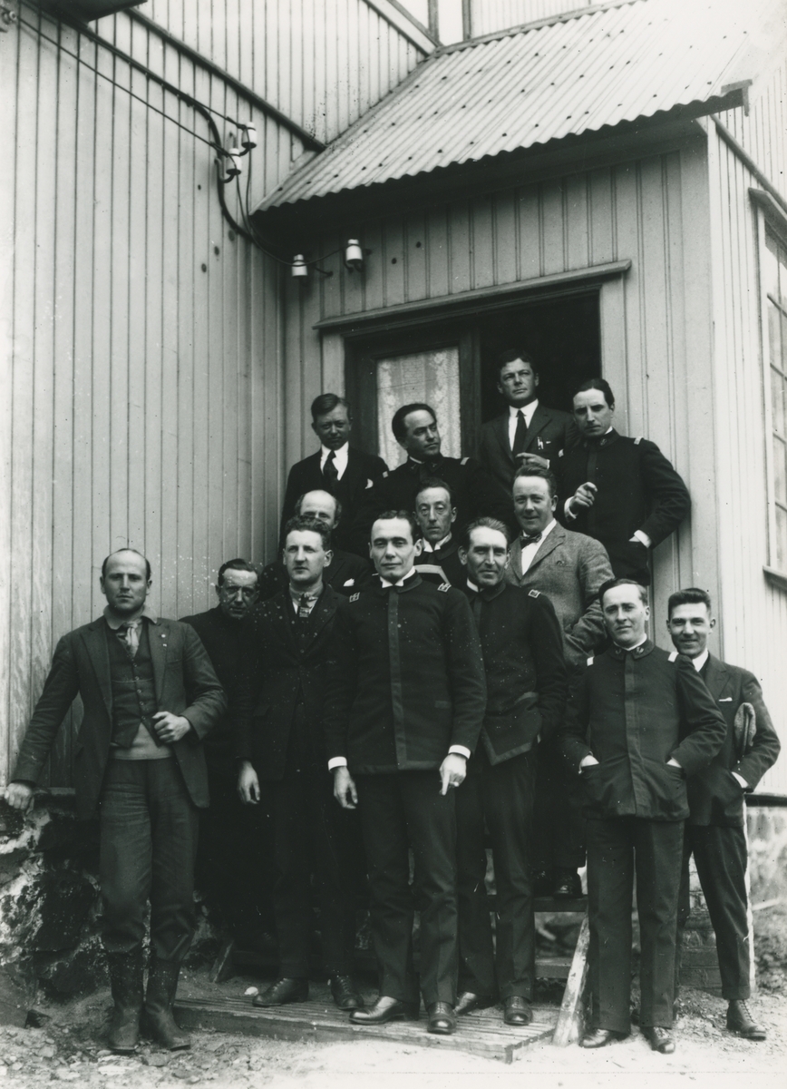 Bild från expedition i Antarktisområdet. Motiv av en samling män som poserar utanför hus.