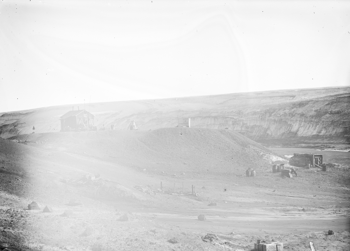 Fotografi från expedition till Grönland. Vy över litet trähus i bergslandskap.