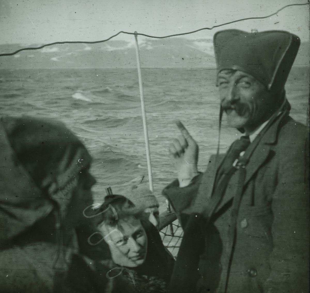 Fotografi från expedition till Spetsbergen. Motiv av man och kvinna ombord på båt.