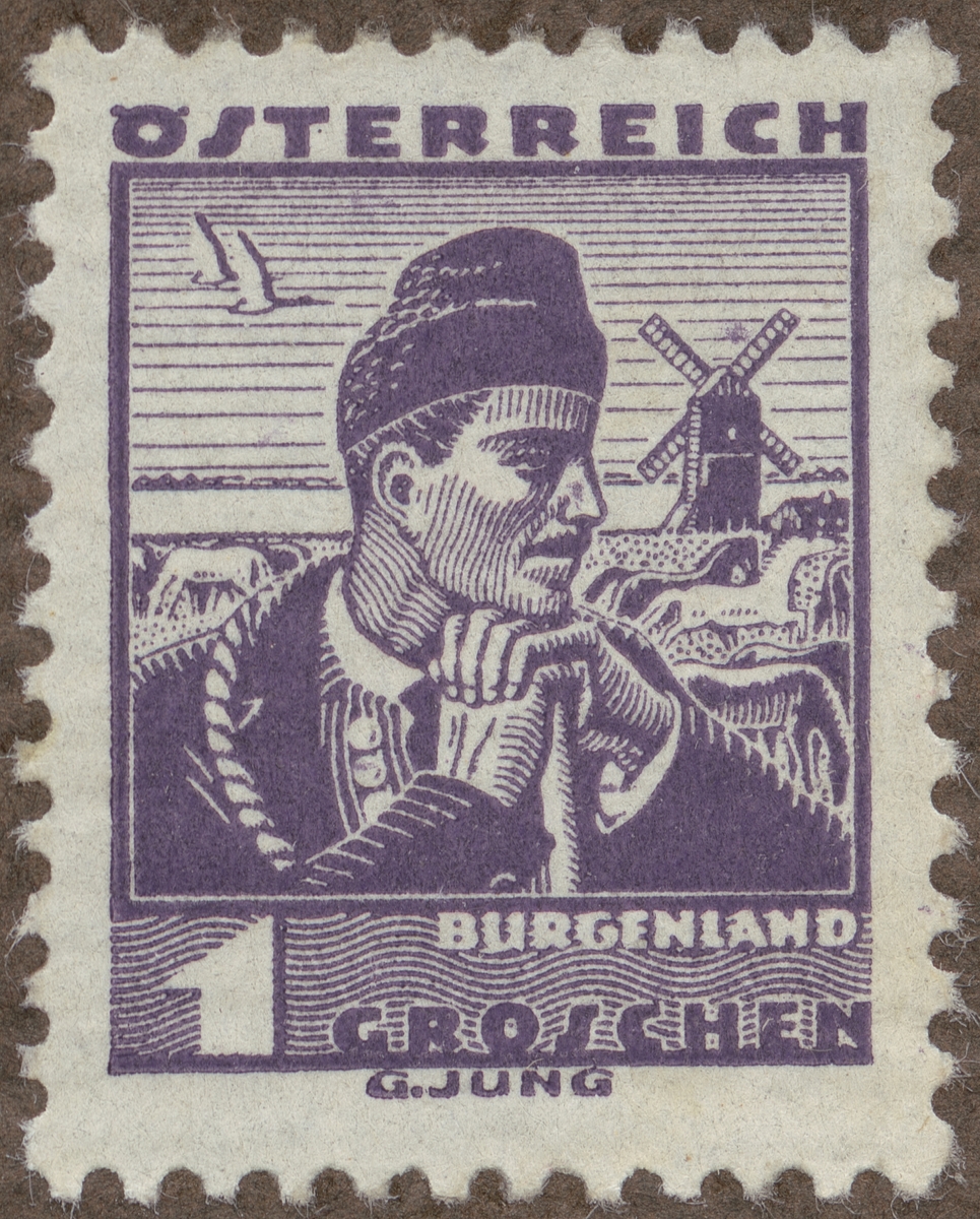 Frimärke ur Gösta Bodmans filatelistiska motivsamling, påbörjad 1950. Frimärke från Österrike, 1934. Motiv av Österrikisk mjölnare vid väderkvarn "-Dräkt från Burgenland-"