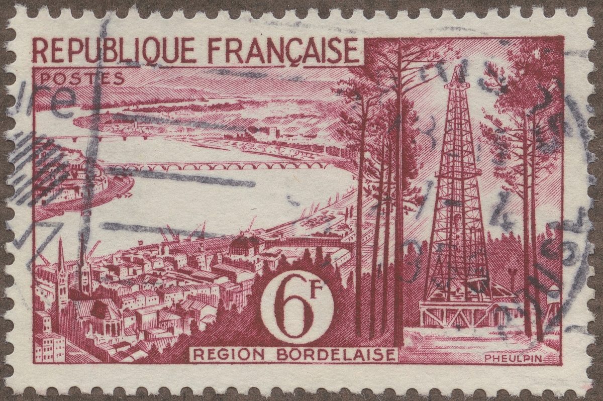 Frimärke ur Gösta Bodmans filatelistiska motivsamling, påbörjad 1950. Frimärke från Frankrike, 1956. Motiv av Radiomast vid Region Bordelaise (Bordeaux)