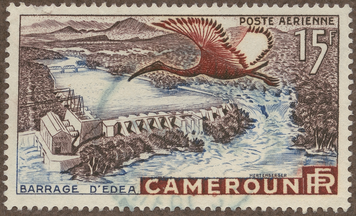 Frimärke ur Gösta Bodmans filatelistiska motivsamling, påbörjad 1950. Frimärke från Camerun, 1953. Motiv av Edea Kraftverket vid Sanagafloden "Häger: symbol för luftpost. - Officiel invigning av kraftverket- 1953"
