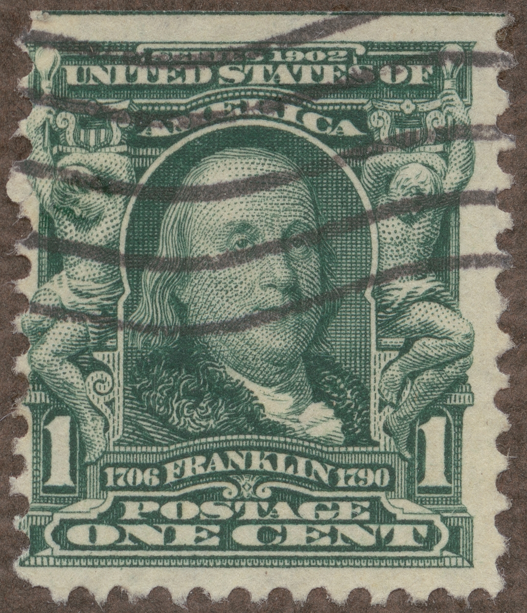 Frimärke ur Gösta Bodmans filatelistiska motivsamling, påbörjad 1950. Frimärke från U.S.A., 1902. Motiv av Symboler för El-belysning "Benjamin Franklin: 1706-1790. Fysiker. Åskledaren. m.m.-"