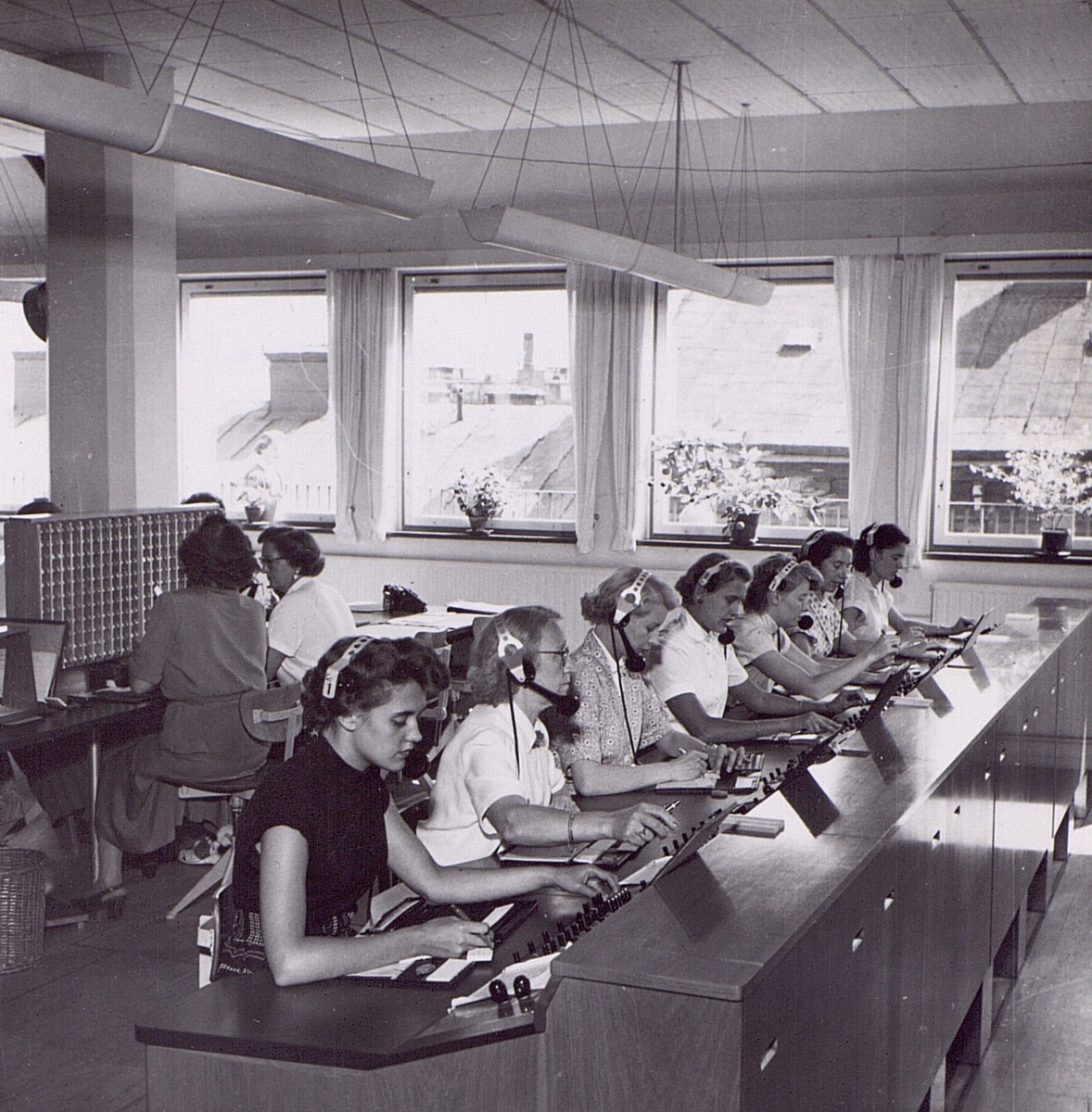 Interiör från den manuella delen av en telefonstation (riksavdelningen) år 1953.